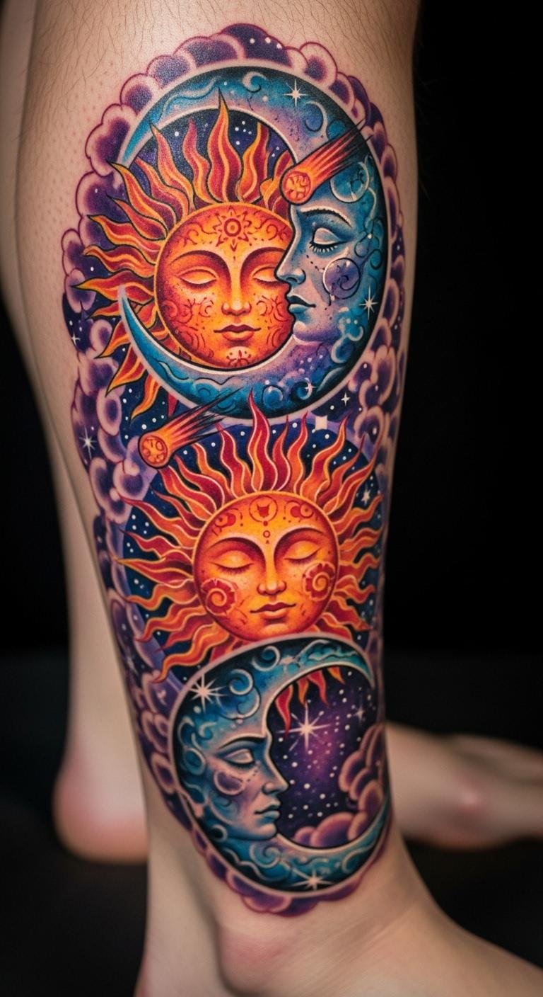 Colored ink variations add pops to sun and moon, like red for sun rays. This brings energy and variety. Customize freely. Blend on paper with markers. Free color palettes online guide. Expect $140 for colors. Place on leg for show. Use kits for tests. Lotion holds hues. Fun for expression. Experiment at home.