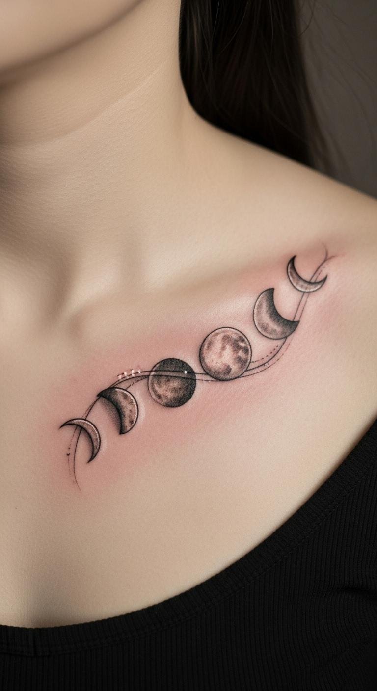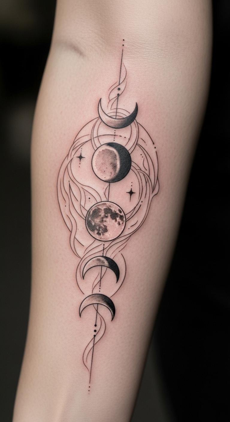 Focus on the feminine moon in this tattoo, with curves that evoke intuition and calm. It highlights phases like a crescent for mystery. Keep it gentle and flowing. Draw soft shapes on paper with pastels from your drawer. Free moon phase apps help visualize changes. Artists often price feminine designs lower, around $90. Put it on your collarbone for a delicate touch. Add flowers with DIY stencils for practice. Moisturize regularly with lotion you have. This one speaks to inner strength. Test the flow on fabric first.