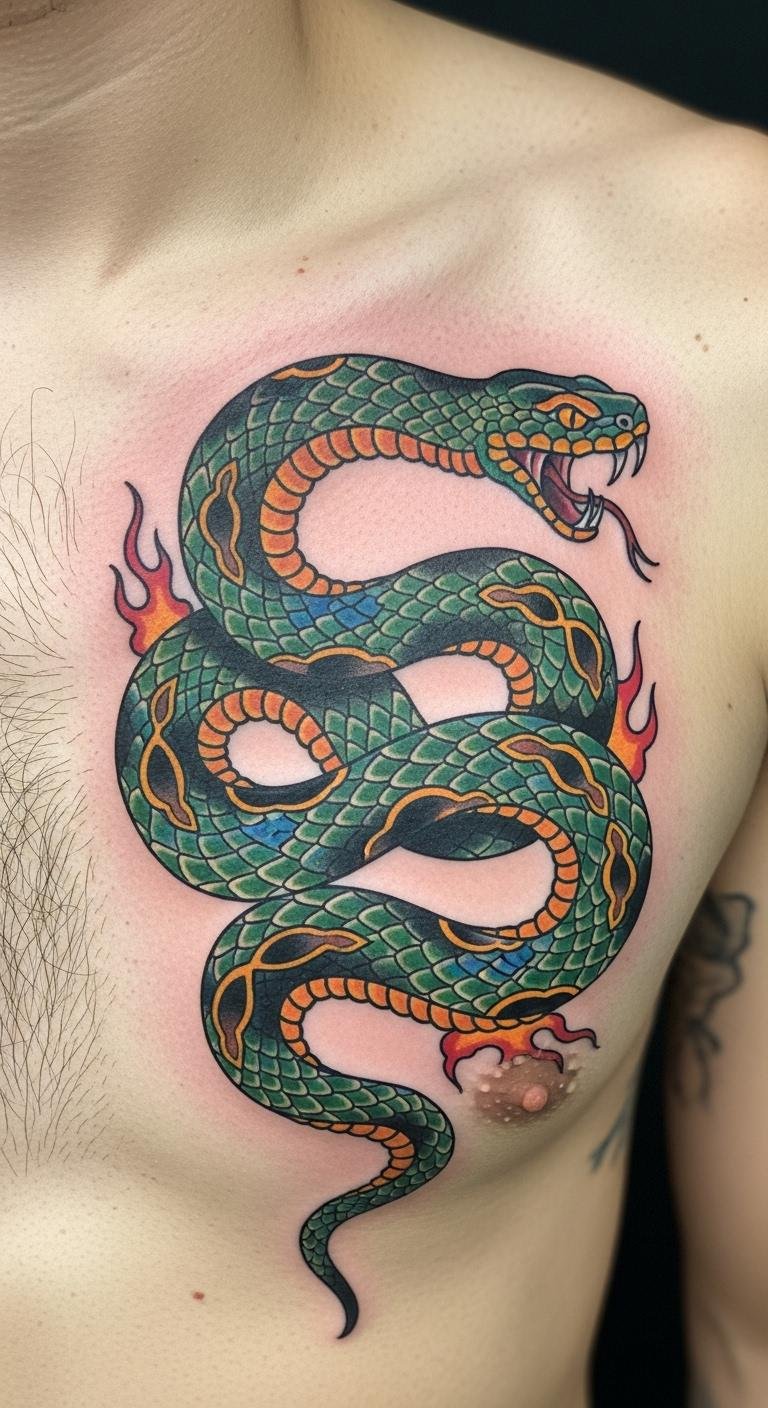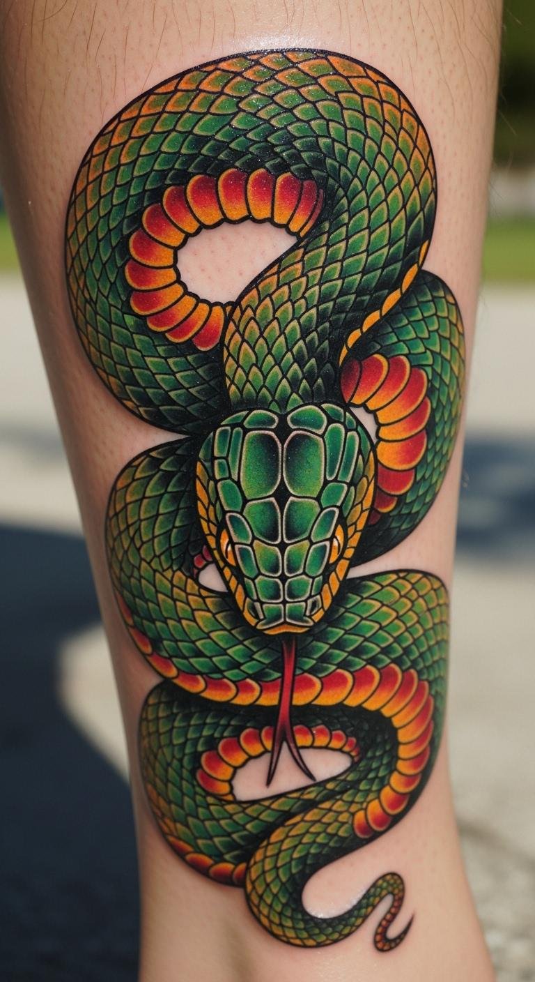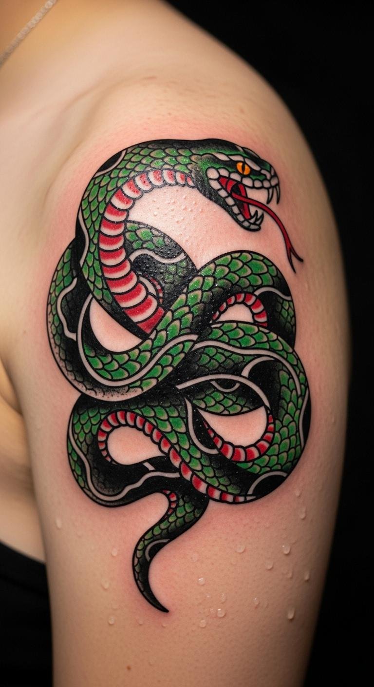 Think of the classic look with its strong outlines and few colors. A traditional American snake tattoo stands out for simple power. It uses green, red, and black to show wisdom and protection. This style works well for first-timers. Pick a local artist who knows old-school methods. It costs less than $200 in many places. Sketch ideas at home with a pen and paper. Add personal touches, like making the snake face a certain way. This design ages well and fits any spot. Go for it if you want something that lasts. Keep it simple to save money. Try drawing on your skin with washable markers first.