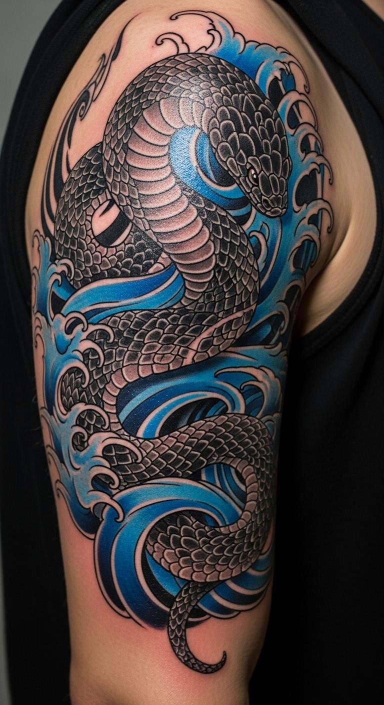 Go big with a full arm cover. A bold sleeve snake design uses the snake’s curve for flow. It mixes colors like yellow and black for impact. This option suits those wanting power statements. Look for budget artists at local shops, often around $300. Practice with arm bands made from string at home. Add elements like waves for extra meaning. It takes one or two sessions, so plan ahead. Wear long sleeves to hide it at work. This design shows off your story every day.