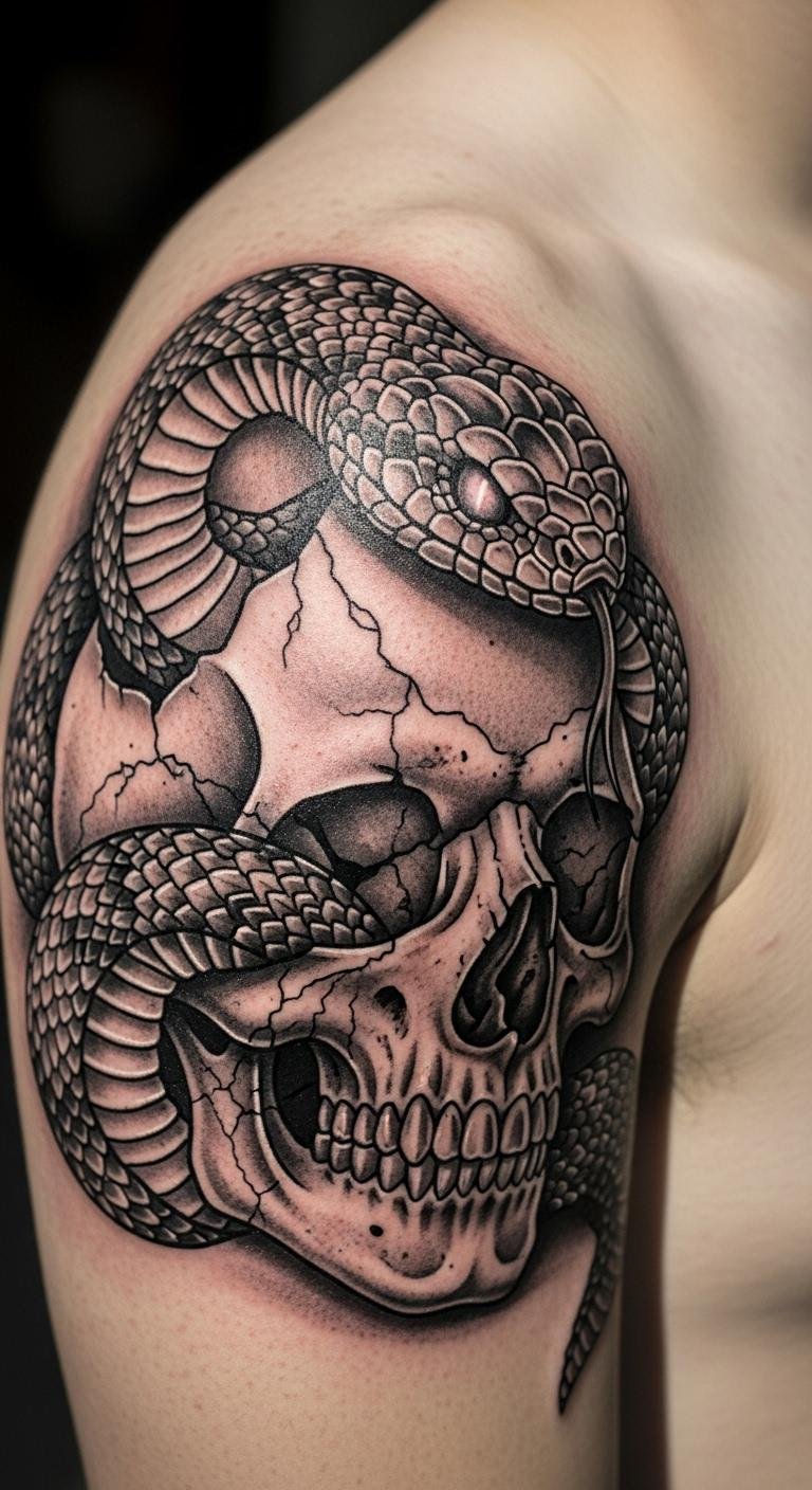Face the dark side. A skull and snake combination merges symbols for mortality. It stands for power deep. Pay $120. Draw skulls simply. Put it on your shoulder. This design tells stories.