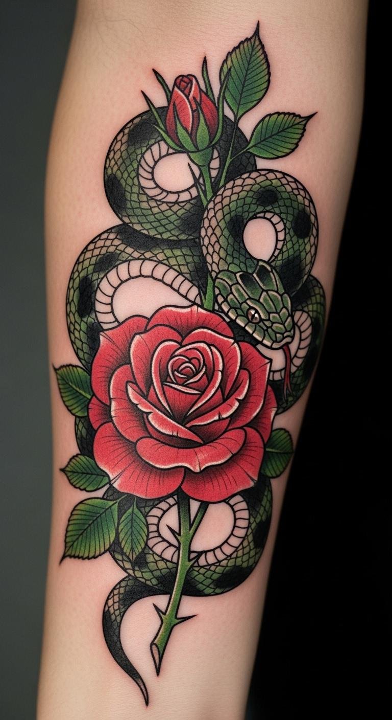 Pair danger with beauty. A snake and rose combination shows balance through shared space. The snake wraps the flower for a classic look. It’s affordable at $100 or less. Sketch flowers and snakes on paper at home. Put it on your arm for visibility. This idea customizes easily. Add colors with markers for practice.
