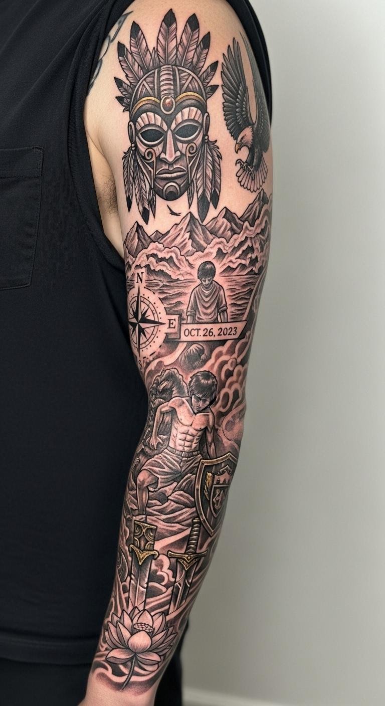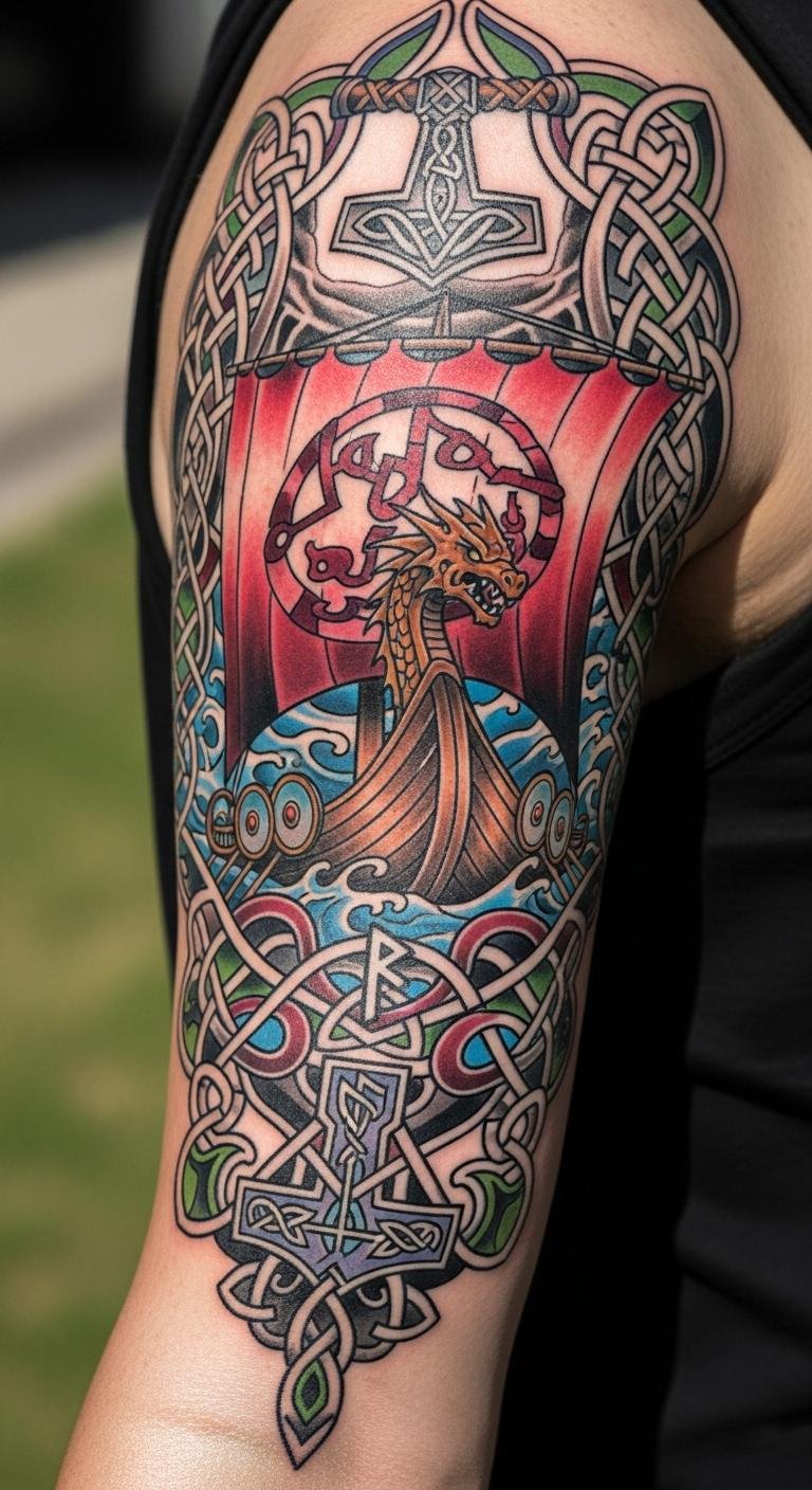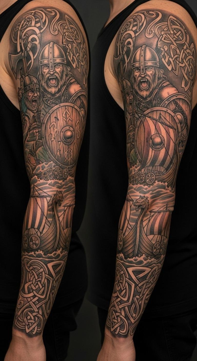 Picture a sleeve packed with Viking elements like fierce warriors and intricate knots. This design wraps around your arm, telling tales of ancient battles and exploration. Start simple: Sketch ideas on paper first to map out the flow. For budget tips, use free online apps to design your own version before hitting a studio. Grab a friend with drawing skills for a DIY mock-up on your skin with washable markers. Keep lines bold and symmetrical to highlight muscles. Mix in personal touches, like adding a small animal motif for extra meaning. Aim for a local artist who offers package deals—check community boards for affordable sessions. This setup not only looks powerful but also adapts to your story easily.