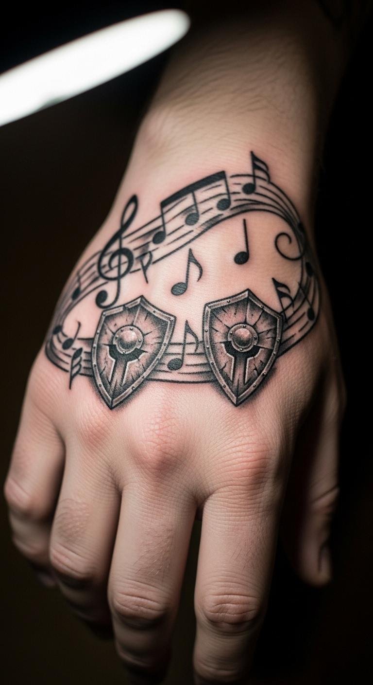 Music notes with warrior shields blend personal passions into ink. Wear it on your hand for constant inspiration. Search free music art and adapt to your theme. Draw notes with household items for a quick mock-up. Stick to essentials for budget control. Pair with a shield for warrior edge. Check for creative fairs offering lower prices. This design syncs with your hobbies, enhancing performances or quiet moments.