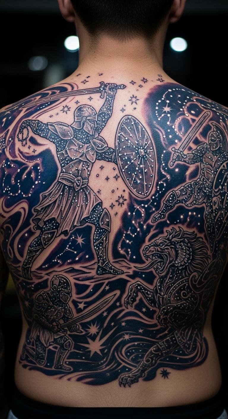Constellations in warrior themes map out celestial fights. Place it on your back for a vast canvas. Star-gaze apps provide free ideas to start. Connect dots on paper for your own star map. Use simple dots to maintain affordability. Add battle elements for story. Seek astrological tattoo deals online. This design lights up your nights, fitting star enthusiasts perfectly.