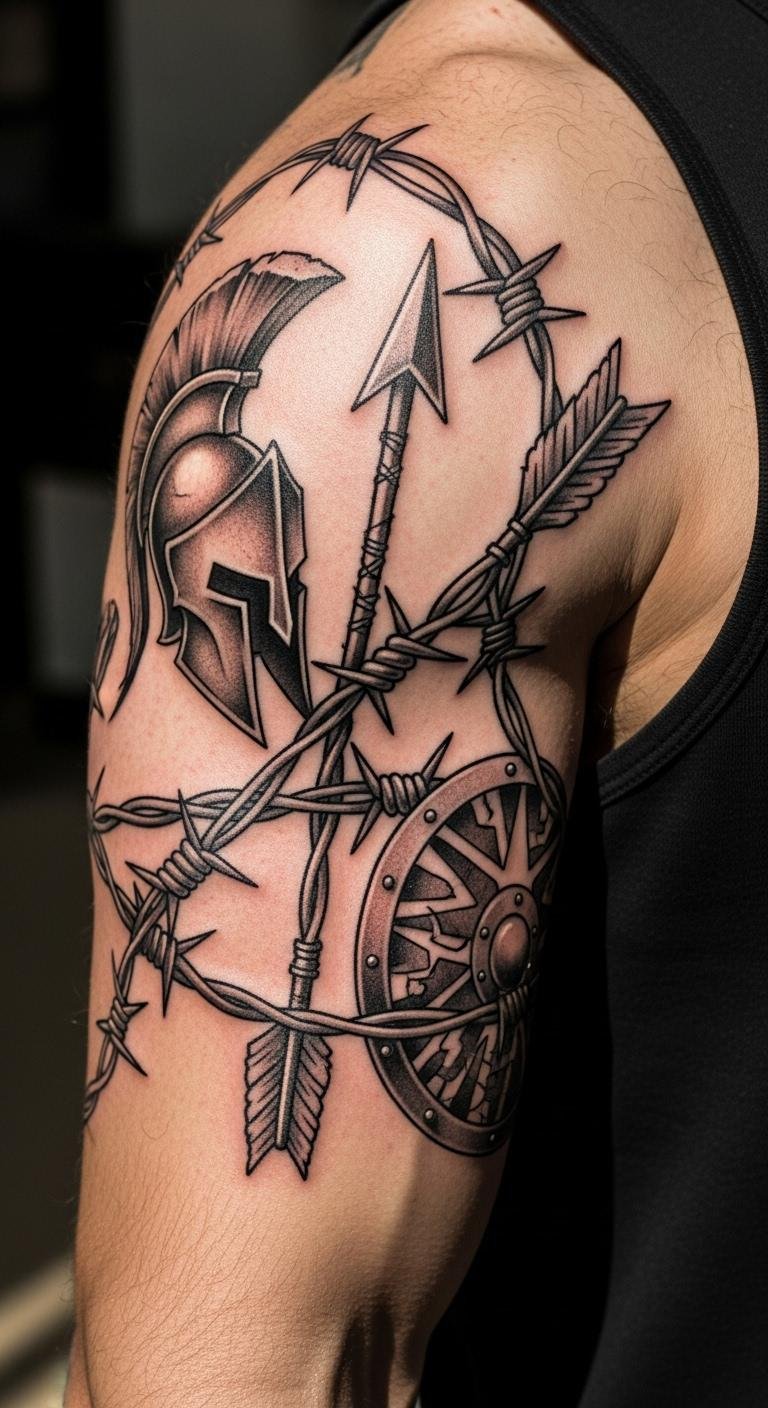 Barbed wire adds resilience to warrior tattoos, symbolizing struggles overcome. Put it on your bicep for strength emphasis. Collect ideas from free galleries and sketch your version. Practice with string wrapped around your arm for a real feel. Opt for basic ink to save money. Layer with a personal symbol like a date for extra significance. Seek out seasonal sales at studios for better deals. This design stands as a tough reminder, working well in professional or casual settings.
