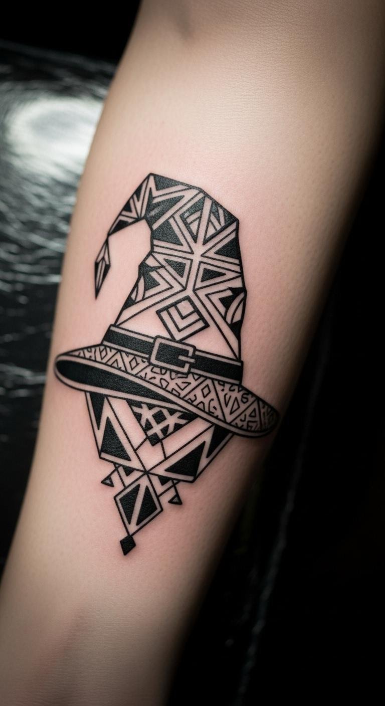 Geometric wizard hat designs feature sharp angles and shapes for a modern feel. Picture a hat made of triangles and squares. This style lasts well over time. Draw your own version using graph paper and a ruler at home. It costs less than complex tattoos. Look for free geometric templates online to trace. Place it on your shoulder for a bold statement. Go with a small size to keep costs down, around $50 to $80. Use henna as a temporary option before going permanent. These tattoos mix magic with art. Add a personal element, like a hidden symbol inside the shape.