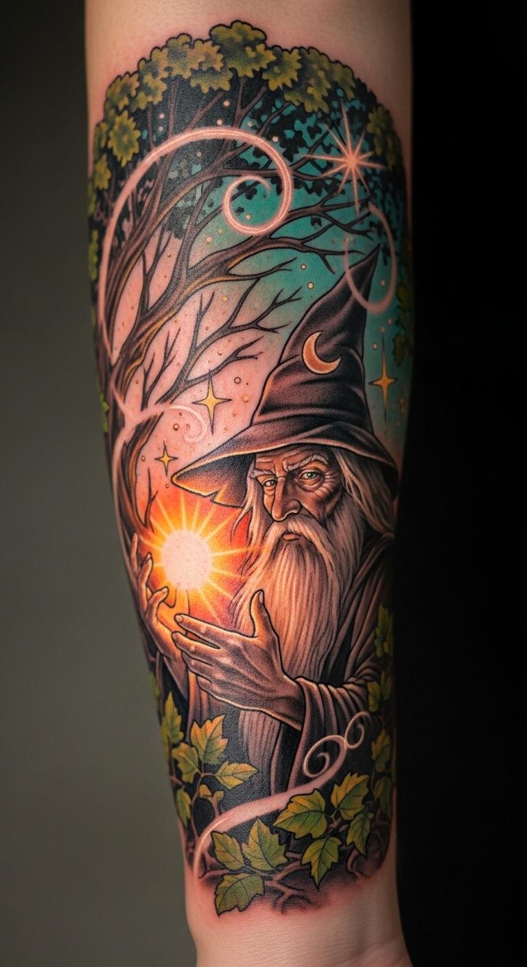 Wizard tattoos with nature mix trees or stars with magic. They connect to the outdoors. Sketch nature scenes on paper. Find free element combos online. Opt for your forearm. Keep it basic for $70. Use nature stamps for tests. These tattoos blend worlds. Add a leaf for touch.