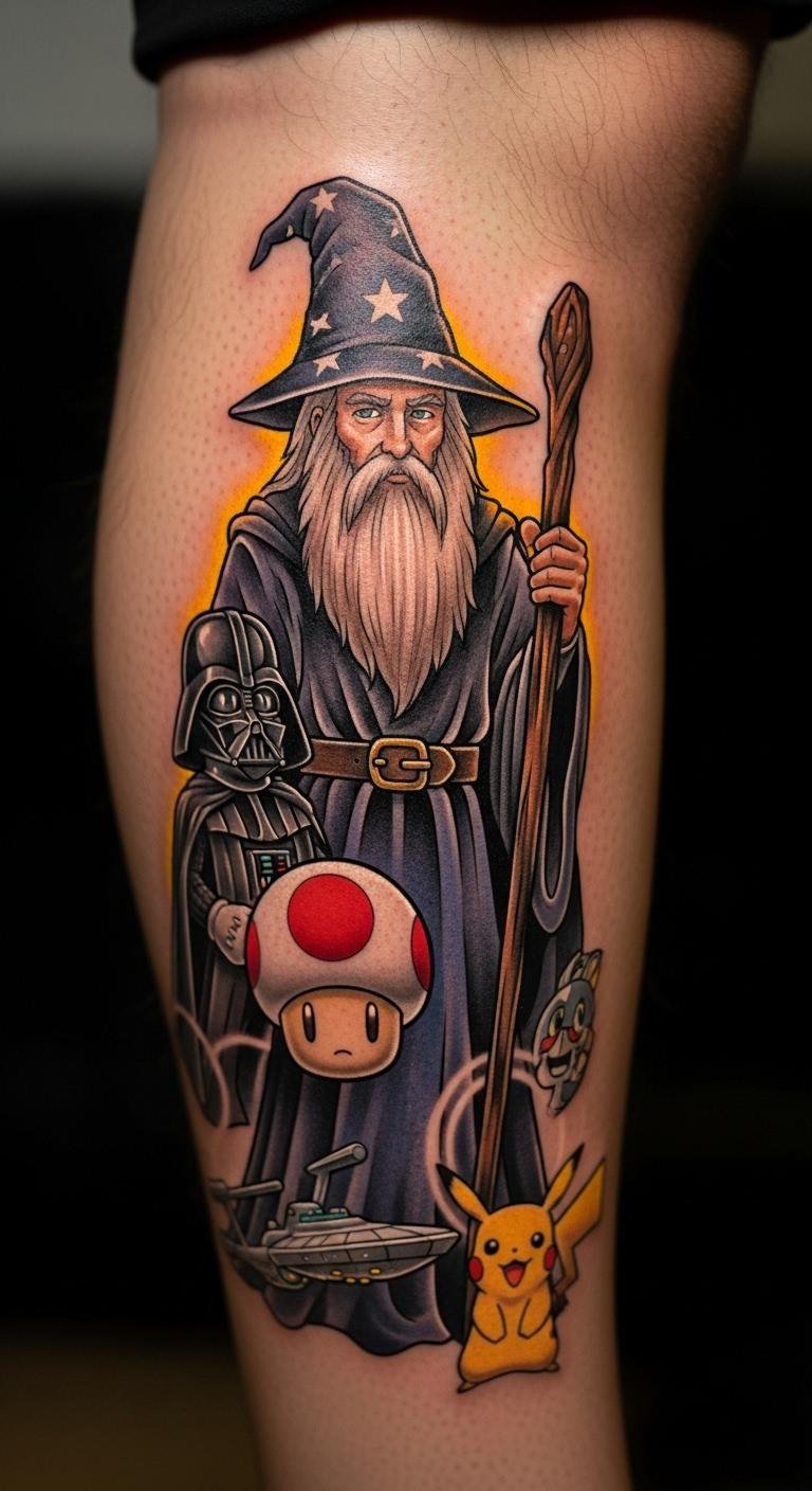 Wizard tattoos with pop culture pull from stories and films. A known icon stands out. Sketch references on paper. Find free pop art online. Put it on your leg. Go fan-style for $80. Use themed stickers to preview. These tattoos celebrate favorites. Add a twist to yours.