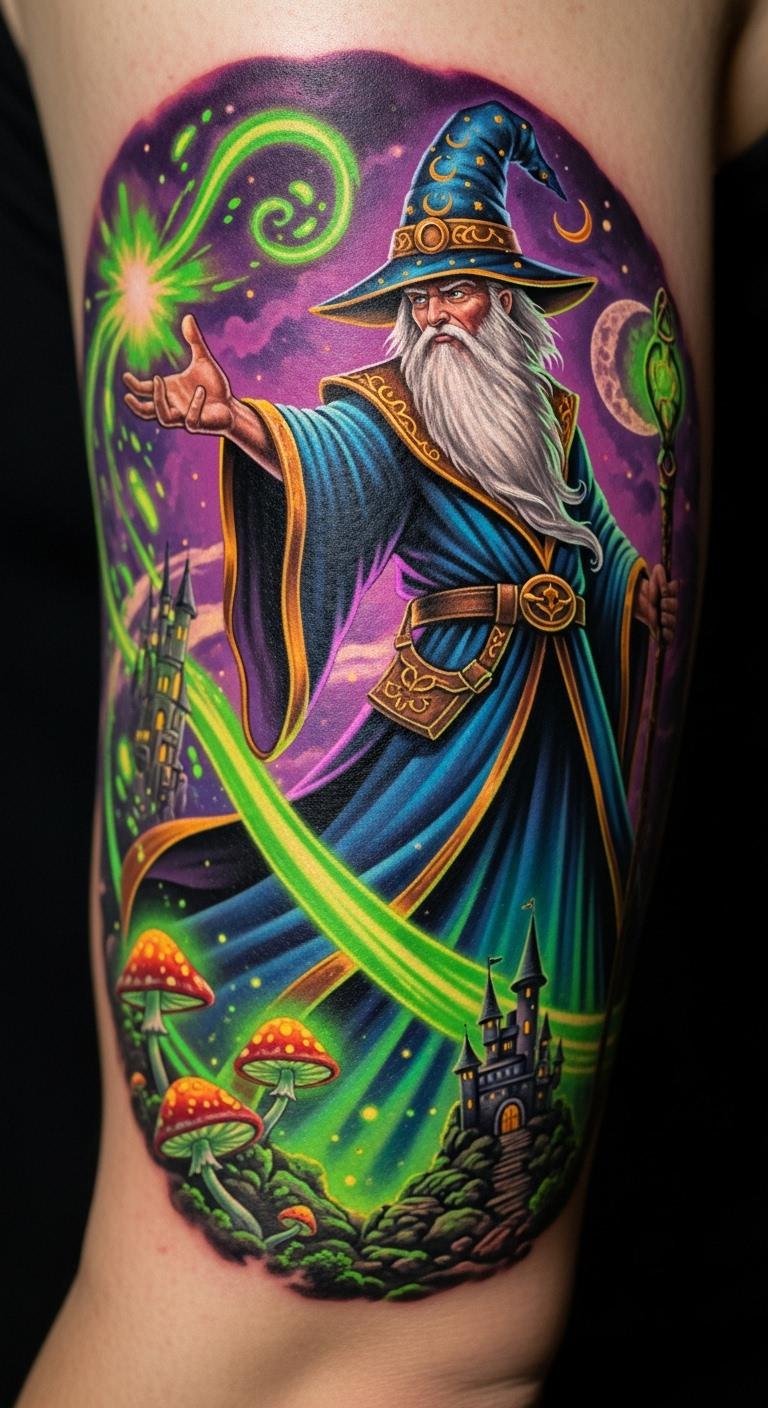 Whimsical wizard tattoos include fun animals or cartoons. They appeal to a playful crowd. Sketch silly wizards on paper first. Find free whimsical art online. Place it on your leg for visibility. Go for small sizes to save, around $70. Try kid’s face paints for practice. These tattoos add joy. Customize with your favorite animal.