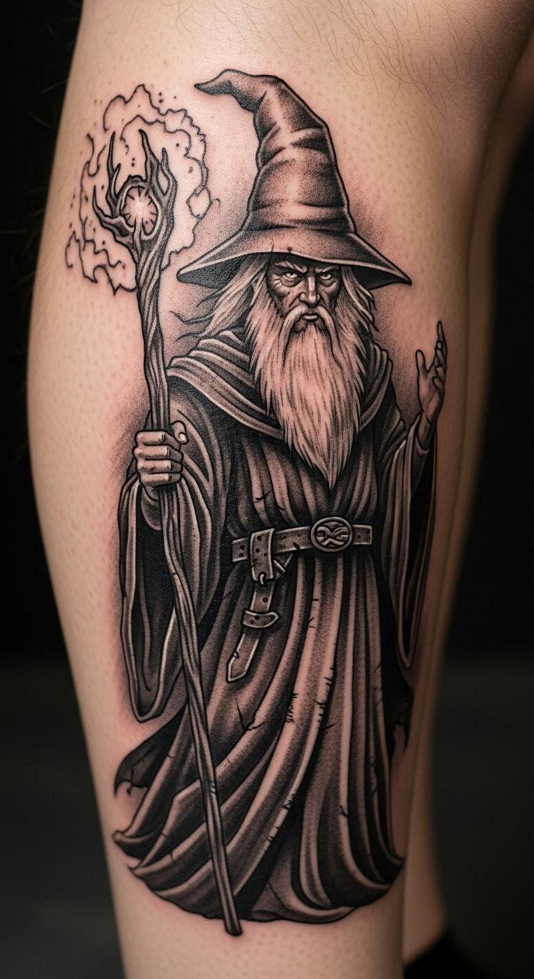 Wizard tattoos in black and gray offer a classic look. Shades create depth easily. Draw in grayscale on paper. Search free mono designs. Place it on your calf. They cost less than color. Try pencil sketches first. These tattoos age well. Add shadows for effect.
