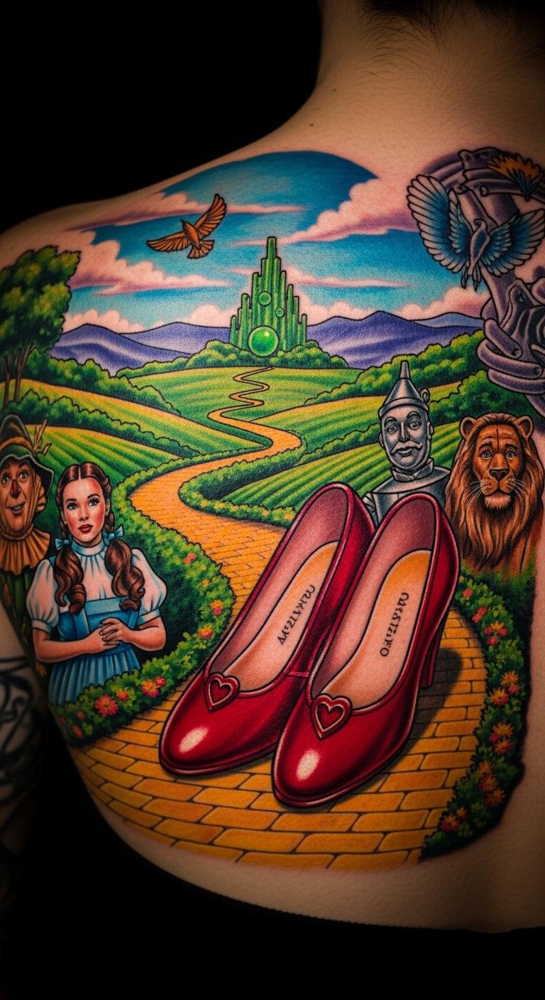 Wizard of Oz tattoos highlight icons like slippers or roads. They capture classic adventure vibes. Draw a simple road on paper as a start. Grab free Oz sketches online to adapt. Choose your calf for easy viewing. Keep it small to stay under $90. Make a DIY version with body paint first. These designs tell a story. Add a personal favorite element, like a poppy flower.
