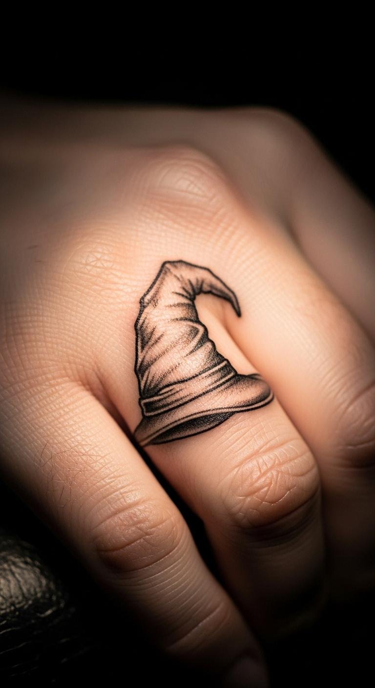 Wizard hat tattoos stand alone or with other elements. A pointed hat says magic in one shape. Sketch hats on paper for fun ideas. Use free hat templates from the web. Put it on your finger for subtlety. Prices drop for tiny ones, about $40. Apply temporary stickers to see how it fits. These tattoos are flexible. Mix it with stars for extra flair.